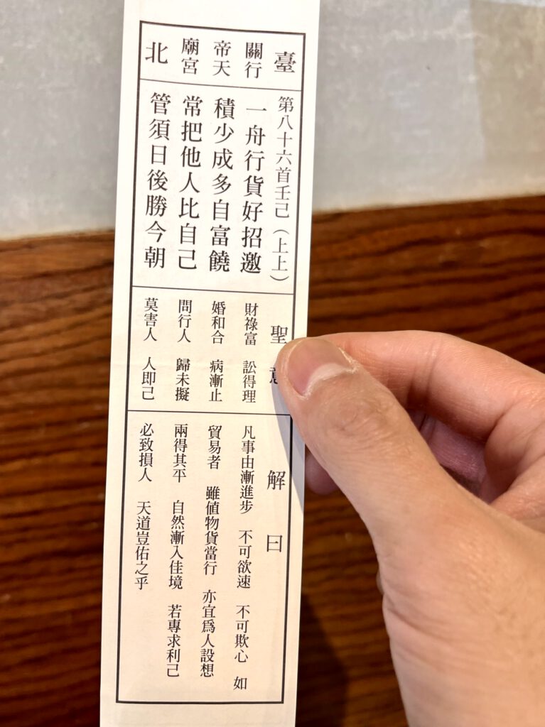 結果第一擲是哭筊,因為她直接問我們那位好友過得好不好,後來發現不能這樣問(似乎是正神不能幫你觀落陰)。所以她改問因為做了這個夢買了薯條神明高不高興?結果馬上聖筊,接著抽籤也是上上籤。